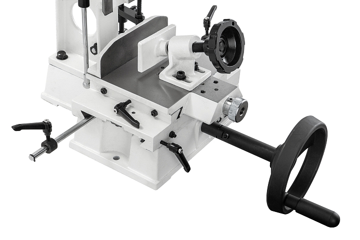 Заготовка размещается на координатном столе вдоль упора и фиксируется винтовым прижимом с наклонной осью. За перемещение вдоль отвечает большой маховик с рукояткой, крайние точки задают регулируемыми концевыми упорами. Движение поперек считается второстепенным и используется в основном для установки резца по центру заготовки, поэтому ходовой винт вращается не маховиком, а небольшой ручкой с накаткой. Все детали стола, включая упоры и прижимы, сделаны из чугуна, что обеспечивает жесткость и отсутствие вибраций при работе.