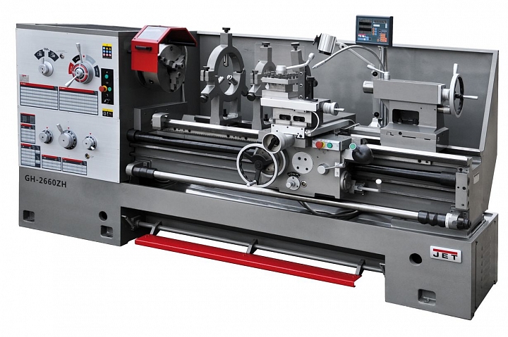 Предусмотрена низкая скорость 36 об/мин для нарезания резьбы плашкой. Коробка подач имеет 65 продольных и поперечных автоматических режимов, что позволяет нарезать все известные типы резьб с точностью и качеством: частота биений на шпинделе не превышает 9 микрон, а цена деления нониуса – 0,02 мм. На GH-2660 ZH DRO предусмотрены: толчковый режим пуска двигателя для облегчения переключения режимов скоростей, быстрое перемещение суппорта, педаль тормоза и экстренного отключения. Шестерни станка тщательно закаливаются и работают в масляной ванне. Это позволяет повысить ресурс изделия, снизить шум и решить проблему охлаждения. Как и все станки JET данного класса GH-2660 ZH DRO устанавливается на массивную станину из качественного чугуна, что позволяет снизить вибрации и эффективно отводить тепло при работе.